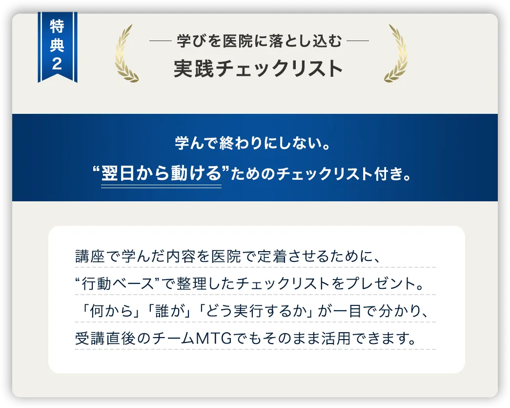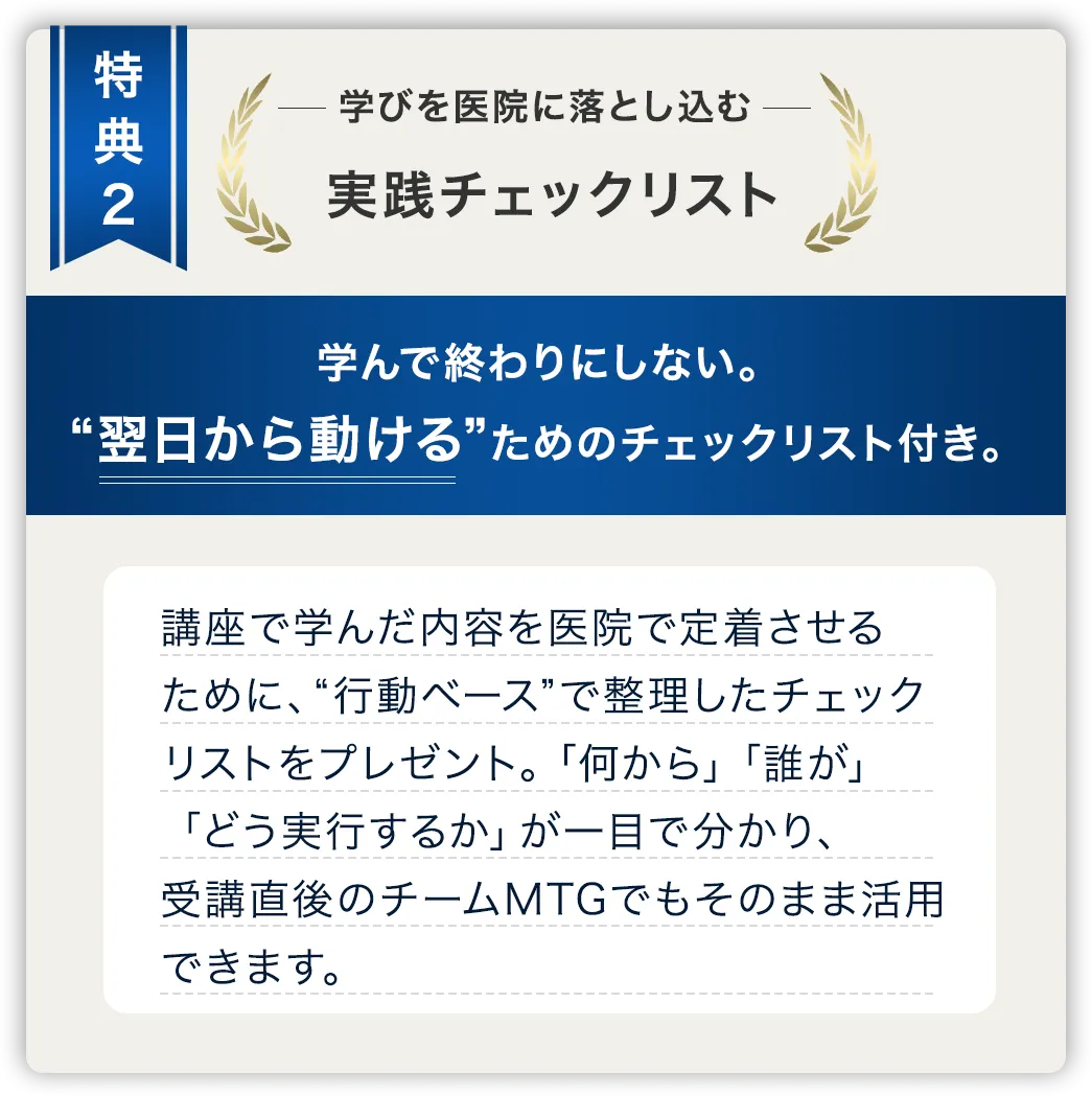 明日から医院に導入できる具体的なアクションリストを持ち帰れる