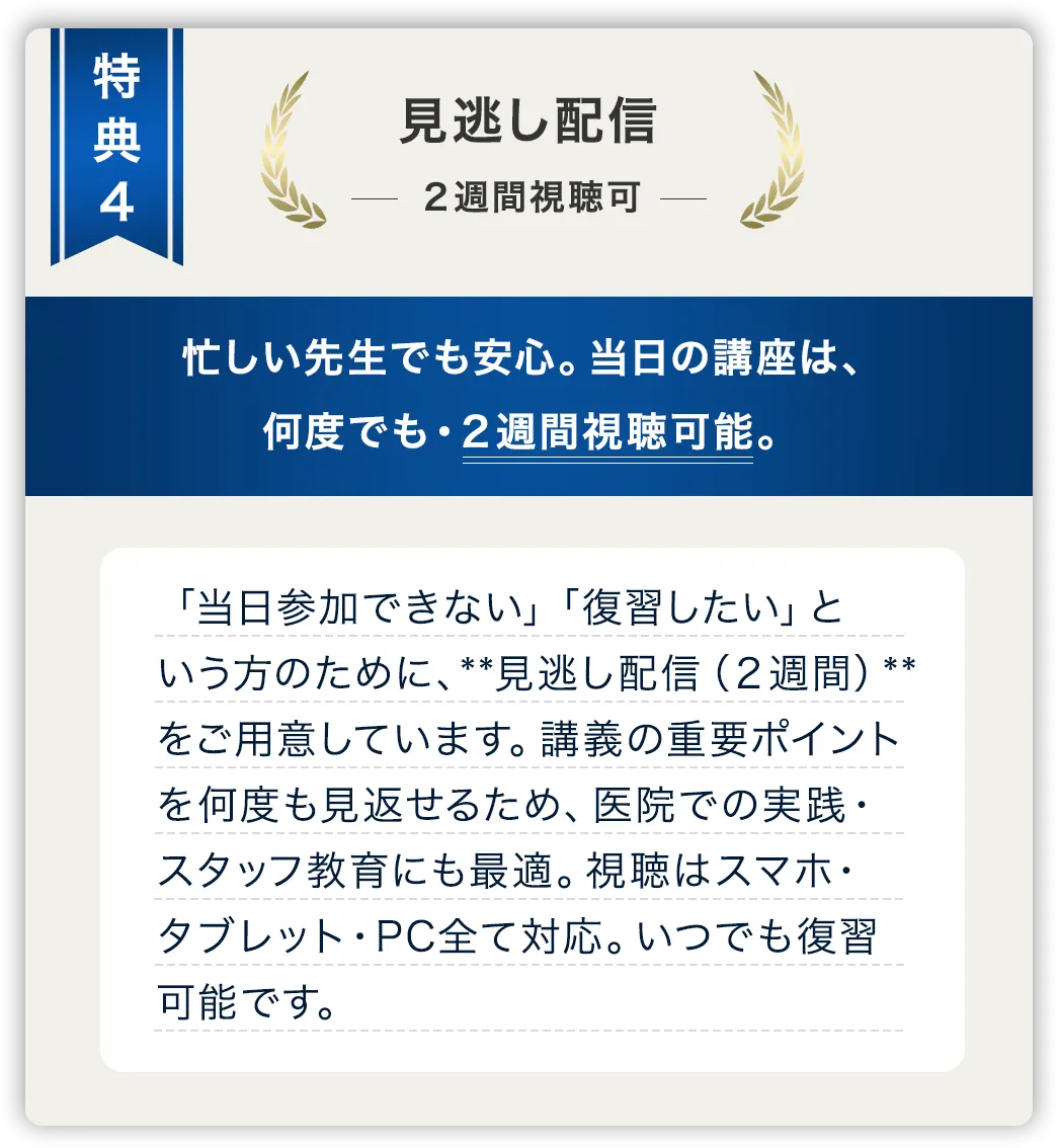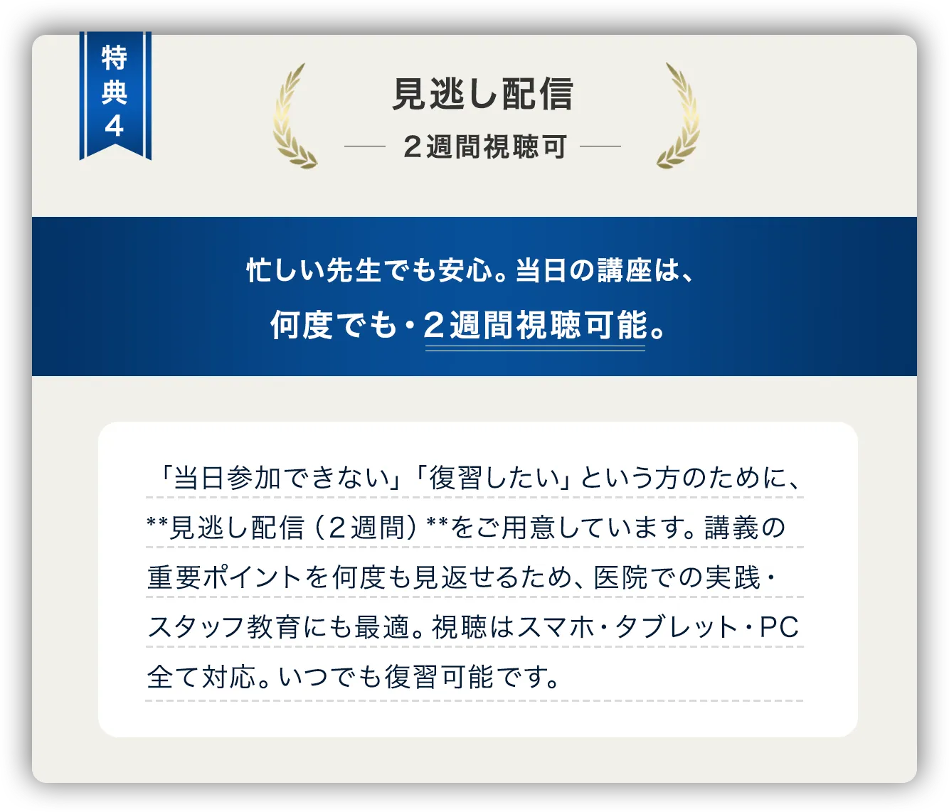 A 見逃し配信をご用意しています。2週間何度でも視聴可能です。 -